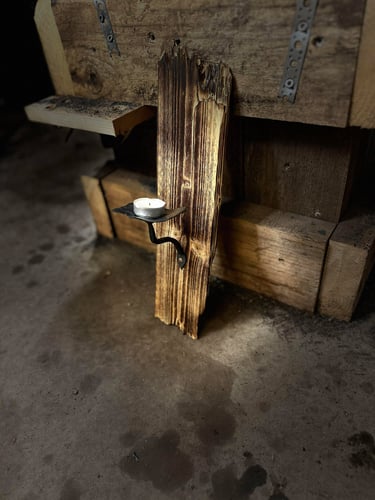 Unik, hånd smidd te lys holder. Autentiske kombinasjoner satt sammen for å skape et rustikk uttrykk.